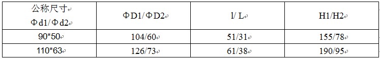 其中“ΦD1”表示管件主管口公称外径,“Φd1”表示管件主管口公称内径,“ΦD2”表示管件支管口公称外径,“Φd2”表示管件支管口公称内径,“L”管件主管口承插长度,“l”表示管件支管口承插长度,“H1”管件长度,“H2”表示管件中心距,1.0MPa=10公斤