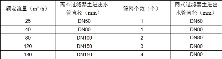其中“直径DN50mm”表示离心过滤器主进出水管直径50mm,“流量50m3/h”表示离心过滤器额定流量50m3h